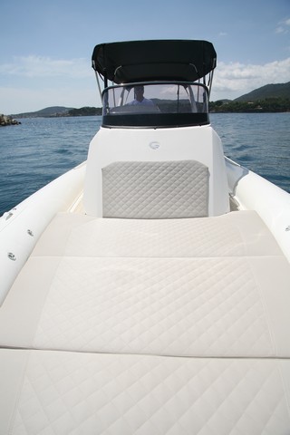 En la unidad probada el piso de la bañera era de Flexiteek, lo que resulta muy agradable de pisar, mientras que el de la cubierta de proa es el estándar de fibra, pero se puede ocultar totalmente bajo unas colchonetas de solárium que la cubren por completo y se prolongan sobre la caseta a modo de respaldo para un par de personas. La parte más próxima a proa cuenta con un gran cofre de estiba y una elevación en proa.