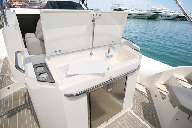 La sección central de la bañera está ocupada por un sofá a toda manga en forma de C que rodea una mesa central de alas plegables, lo que permite comer al aire libre a cinco o seis personas; debajo de los asientos del sofá se han previsto cofres de estiba, que se pueden cerrar con candados, si bien es mejor retirar los cojines de los asientos para tener el máximo acceso a su interior. A continuación está un mueble de servicio que aprovecha toda la parte posterior del asiento del patrón para dar cabida a un frigorífico de 65 litros y, bajo una tapa, un fregadero y una superficie de trabajo para preparar comidas frías; hay posavasos laterales y un sólido asidero por si alguien quiere navegar de pie detrás del patrón.