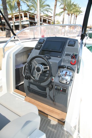El pupitre es de un color gris intenso, lo que evita los deslumbramientos y el patrón gobierna a estribor frente a una gran superficie que permite la instalación de muchos instrumentos. En este caso una pantalla del sistema de navegación y dos correspondientes a los motores Suzuki. Las pantallas de Suzuki dan toda la información imaginable respecto al funcionamiento de cada motor y se pueden configurar en distintas presentaciones para cada una de ellas, de modo que determinados datos se pueden visualizar en una de ellas y el resto en la otra, en presentación analógica o digital, también para navegación nocturna con la tipografía color rojo.