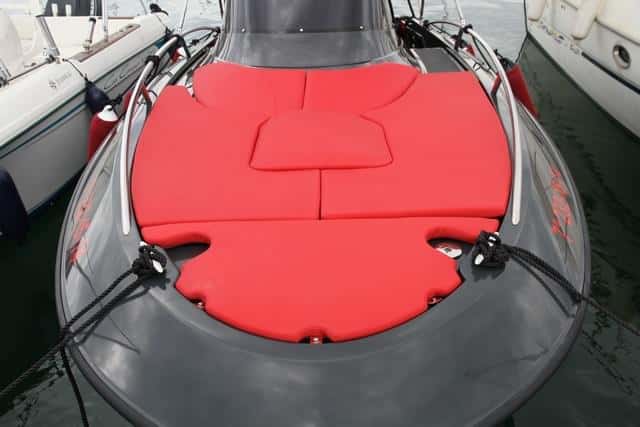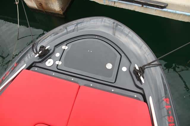La imagen de esta Clear se ve reforzada por la despejada cubierta de proa, con las amuras redondeadas hacia el exterior y el ancla de inox colgada en la roda, ocupada totalmente por un completo y algo embarazoso juego de cinco colchonetas de solárium. El pozo de anclas incluye el molinete de fondeo de serie y la tapa se eleva fácilmente con un resorte de pistón. Las cornamusas de amarre están bien ubicadas delante, pero en popa se han colocado sobre la plataforma de baño, demasiado alejadas de la bañera. Y esto es porque en la popa se han cuidado los perfiles de los costados que caen armoniosamente hasta la misma plataforma de baño.