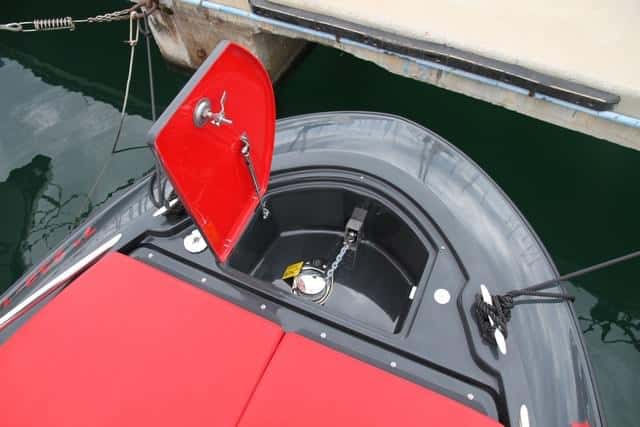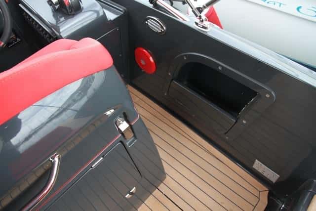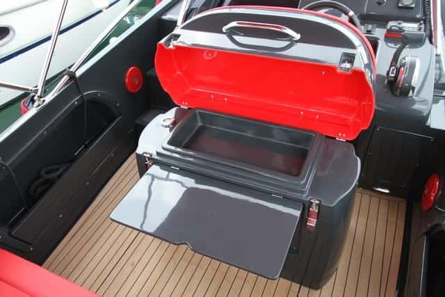 En los costados figuran sendas guanteras, muy útiles para amarras u otros objetos de cierto tamaño. La teca y el contraste del rojo de las tapicerías con el gris granito del gelcoat determinan la estética de este modelo, que llama también la atención por la caída de la popa recordando los automóviles deportivos. En otros barcos este espacio que cubre el compartimiento del motor se hubiera destinado a una pequeño solárium, pero Clear prefiere afirmar su elegante estética.
