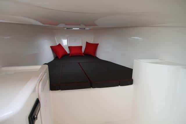 La cabina en una deportiva de esta eslora con la cubierta baja es un espacio de estancia temporal, aunque por sus dimensiones perite pernoctar a dos personas cómodamente. Está realizada en contramolde, con total ausencia de elementos decorativos y de la madera que rompan el predominante blanco del gelcoat. Cuenta con una buena escotilla cenital, un mueble de servicio junto a la entrada y un espacio a estribor que admite un gabinete independiente para el aseo, con un lavabo y un inodoro.