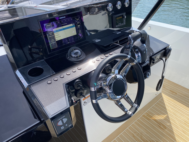La consola, vertical, deja espacio para la pantalla multifunción y los indicadores de los cuatro Mercury, además de contar con un compás magnético —importante—, el cuadro de interruptores, la hélice de proa, el control de los interceptores Zipwake, etc. El volante, de estilo deportivo y muy agradable al tacto, es ajustable y las palancas electrónicas se han ubicado perfectamente al alcance de la mano. No faltan portavasos y una guantera, pero echamos de menos un reposapiés. Los cuatro asientos monoplazas tienen la base plegable, lo que permite gobernar semisentados.