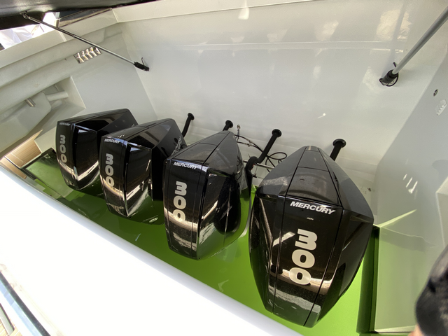 Si en los interiores este barco ofrece un sinfín de posibilidades, también lo hace en la motorización. Hasta siete posibilidades, siempre con Mercury, se pueden equipar con montajes de dos, tres y hasta cuatro fuerabordas. Seguramente, una de las más interesantes, y que estará disponible en breve, sea con los dos nuevos Mercury V12 de 600 Hp, un fueraborda muy avanzado tecnológicamente que cubre perfectamente las necesidades de potencia de este barco. Con tres fuerabordas está la opción de los V8 de Verado 300 y de nuevo con los tres V12 de 600 Hp, potencia, ya que con 1.800 Hp este barco puede ser algo realmente impresionante navegando por encima de los 50 nudos. Y en montajes cuádruples se pueden montar los 300 V8 de Verado; los 350 o 400 Verado con 6 cilindros en línea, y los 450 de Mercury (que suman 1.800 Hp también). Así pues, las posibilidades son muy amplias. De todos modos, nosotros navegamos en aguas de la bahía de Palma de Mallorca con cuatro Mercury Verado V8 de 300 Hp, potencia de 1.200 Hp que resulta suficiente para superar los 45 nudos, aunque según el astillero en óptimas condiciones de mar, carga y limpieza de casco, se pueden alcanzar los 50 nudos.