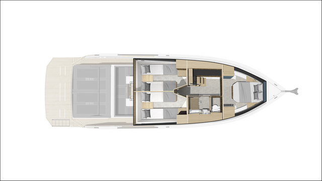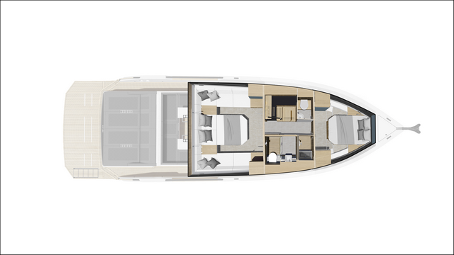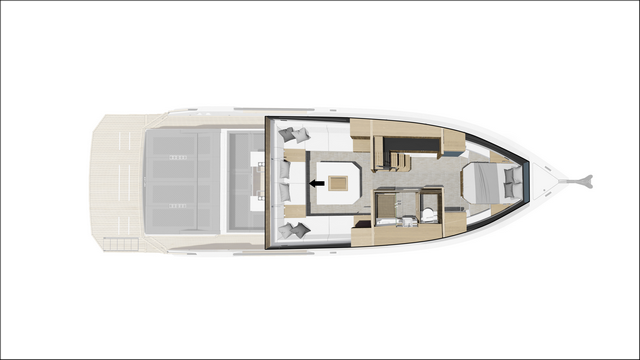 Sin embargo, la unidad que navegamos era la versión con dos cabinas. Sencillamente espectacular por lo ingenioso y simple de cómo soluciona el astillero un camarote de armador en transformación a salón o viceversa. Una gran cama doble rodeada de sofás se desplaza hacia el centro haciendo las funciones de mesa de salón; y si se mueve de nuevo hacia la cabecera, toma la forma de cama. Más sencillo imposible.