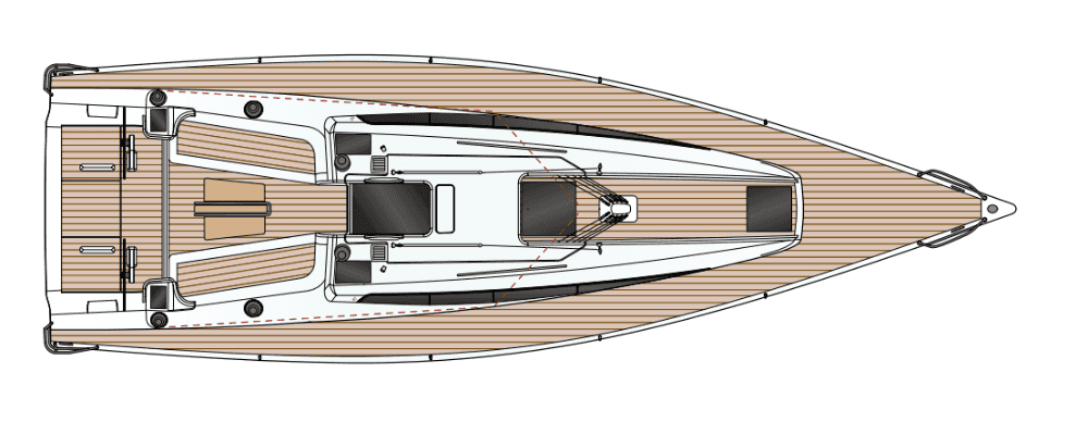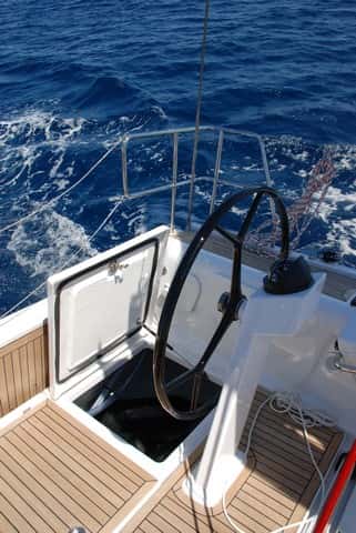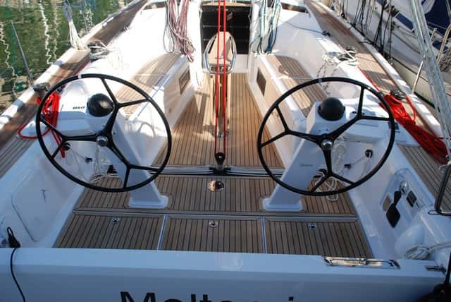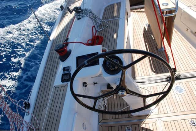 Son numerosos los puntos que un propietario al que le guste afinar las velas para sacarles el máximo partido sabrá apreciar. Uno de ellos es el carro de escota de mayor enrasado en el plan de la bañera, frente a las dos bitácoras inclinadas, que dejan un buen espacio de circulación entre las ruedas de gobierno, a cuyos pies se encuentran dos cofres de gran capacidad. Las consolas de instrumentos se sitúan a las bandas y no en los pedestales de bitácora (que solo albergan el compás) inmediatamente detrás de las bancadas de la bañera, perfectamente integradas en las entregas de las brazolas y disponen de buenos agarraderos de inox.