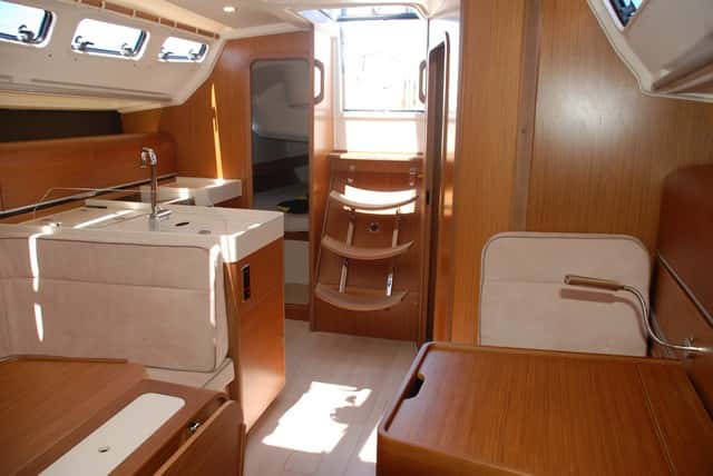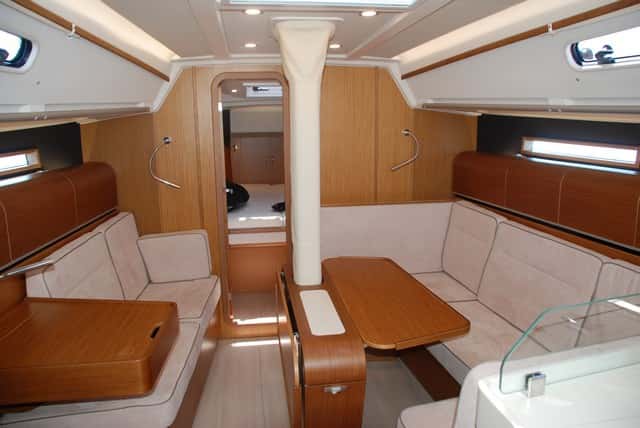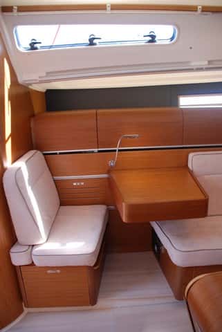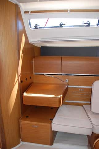No es esta sin embargo la única astucia destacable en el diseño interior. La mesa de cartas ofrece también una solución para reducir el espacio que ocupa en la zona central del barco. Dos raíles laterales permiten desplazarla hacia proa  o popa, de manera que, una vez adosada al mamparo del baño, permite ganar una plaza en el sofá de babor, espacio que puede usarse como litera o simplemente para que hasta seis personas puedan compartir la mesa a sus anchas.
