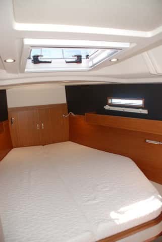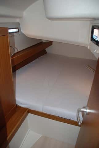 La cabina de proa dispone de baño propio. Hay ropero, estiba bajo la cama, cajones y repisas laterales.