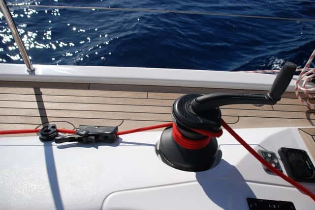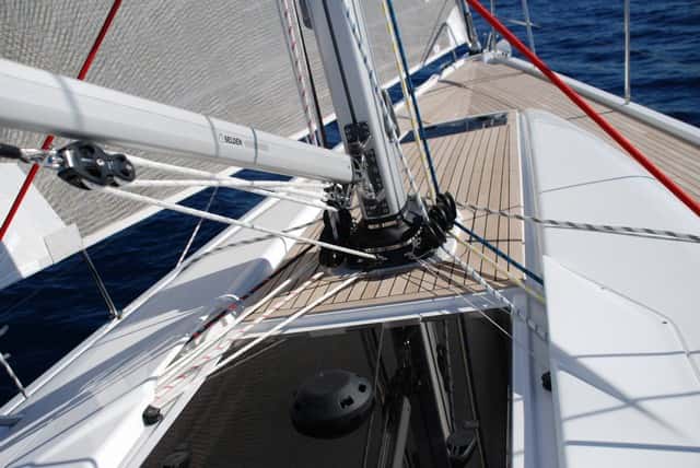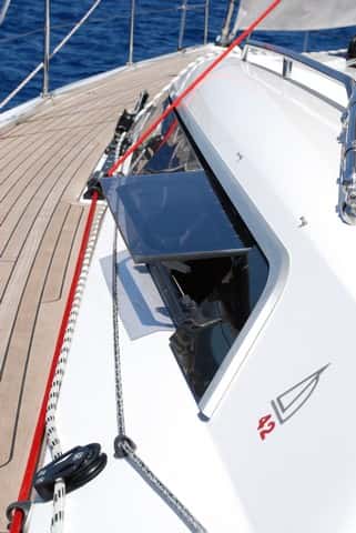 Dos escotillas a ambos lados del tambucho permiten pasar por ellos los cabos de maniobra sin que molesten ni en cubierta ni en la bajada al salón. Hay cáncamo para bárber, la contra es fija y el aparejo tensor de cabo del baquestay posee una efectiva desmultiplicación de 48:1.
