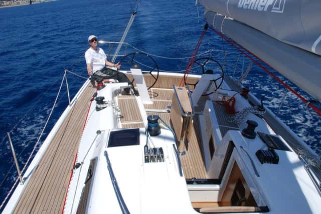 A bordo con Karl Dehler. La posición al timón es perfecta, con el winche y la mordaza del carro al alcance de la mano y una posición sentado que permite sujetar la rueda entre las piernas.