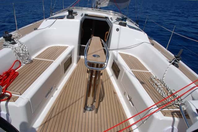 La cubierta del Dehler está diseñada para navegar y maniobrar con comodidad y circular sin obstáculos.La escota de mayor, como en el 38, es a la alemana, el carro de escota de génova está entrado hacia la caseta y los cadenotes son exteriores lo que deja un buen paso hacia proa. El pozo de anclas es suficiente y el enrollador de génova, un Furlex TD 300, está bajo cubierta, lo que facilita la maniobra de fondeo y con el gennaker, cuyo anclaje se sitúa en la guía de inox del ancla. Las cornamusas son escamoteables,disponemos de reposapiés que pueden situarse donde uno desee y el antiderrapante es efectivo sin ser agresivo. Todos los elementos de la cubierta son enrasados y los cabos están reenviados escamoteados bajo el tejadillo.También los bancos de la bañera disponen de recesos para apoyar los pies en la escora sentados en las brazolas, cuya inclinación las hace especialmente cómodas.
