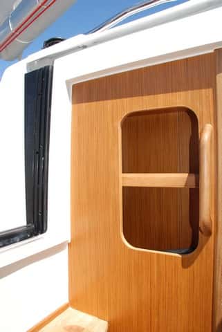 Todos los cabos del palo son reenviados bajo el tejadillo. Hay buen antiderrapante y más que suficientes cáncamos para poleas suplementarias.