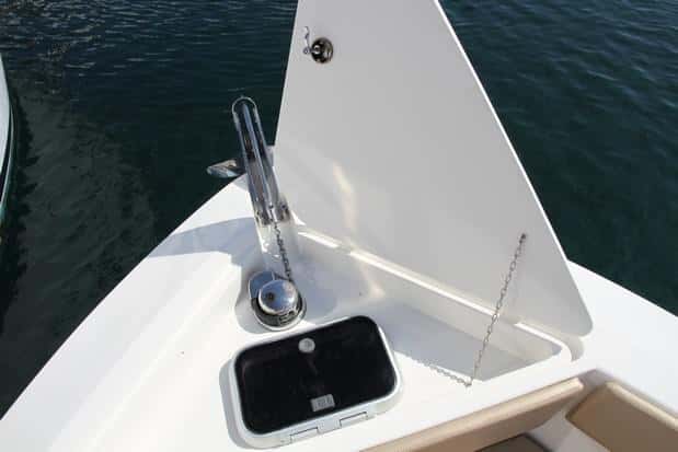 Esta eslora se ha concebido con una consola central de notables dimensiones que respeta, sin embargo, el movimiento por la cubierta. El equipamiento en proa es el necesario, con la roldana de ancla de acero inoxidable, pozo de cadenas y escotilla de acceso al pozo de cadena del ancla, además de dos cornamusas de inox bien ubicadas en proa (y dos pares más a media eslora y en popa). La zona de proa está ocupada por una dinete en V convertible en solárium, que queda muy protegido gracias al notable francobordo. Debajo tres cofres de estiba complementan los que hay bajo el banco de popa (con un vivero con bomba de agua a presión), por lo que este aspecto, hay espacio para guardar lo que se quiera.