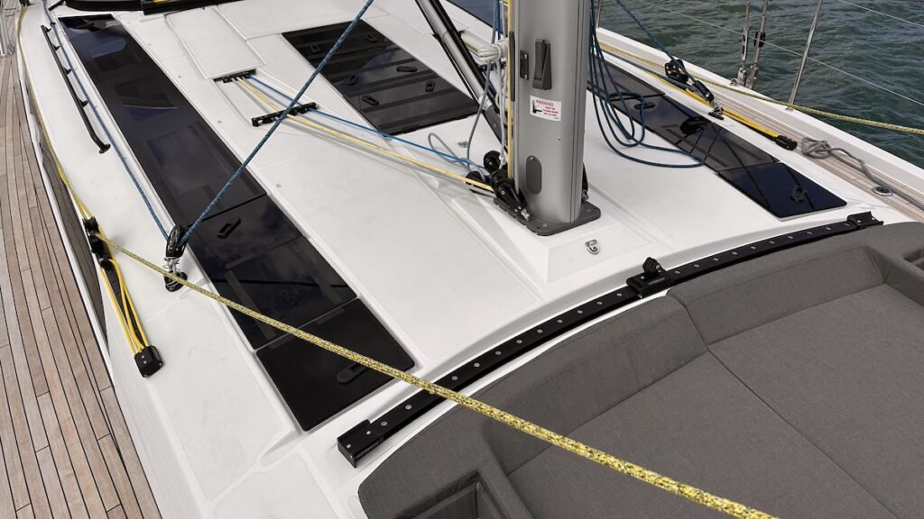 Para completar la experiencia de vida al aire libre, el Dufour 48 ofrece una opción de techo rígido para una mayor protección de la bañera. Este techo rígido cuenta con dos aberturas para ver la mayor, de forma que se pueda controlar des- de ahí la baluma. Dado que este techo rígido cubre totalmente la bañera, el espacio de solárium de proa frente al tejadillo cobra mayor importancia. La versión eléctrica también ofrece espacio adicional para paneles solares. Son 13 m2 de paneles con una capacidad de 1.300 W.