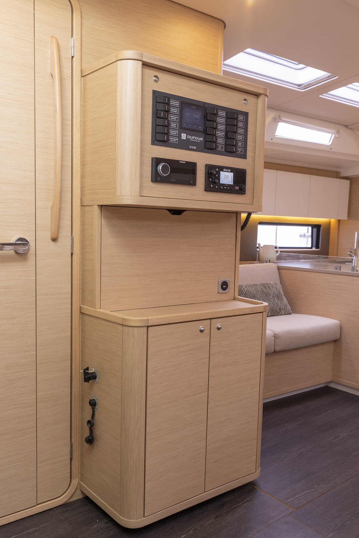 No faltan detalles para hacer más agradable la estancia a bordo como la sección acristalada del techo de la cabina del propietario que permite observar las estrellas en el cielo nocturno desde la cama. Además, si lo que se desea es privacidad absoluta o que no entre la luz en los camarotes con los primeros rayos del amanecer o en el amarre, las persianas opacas están integradas en el techo. Es original la mesa de navegación vertical, para trabajar de pie, con armario debajo y el panel de control eléctrico encima… De hecho, deja más espacio libre en el salón y con los sistemas actuales que equipan todos los barcos, la mesa de navegación tradicional pierde un poco su sentido hasta el punto de que en muchos modelos ya ni existe. Pero como en todo, tendrá sus adeptos y sus detractores. En todo caso, ahí está, y puede usarse tanto para dejar objetos como para hacer una consulta rápida de la carta.