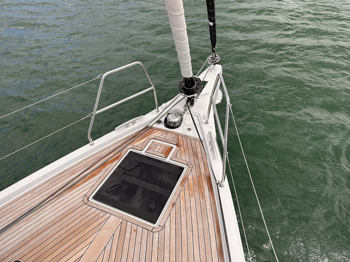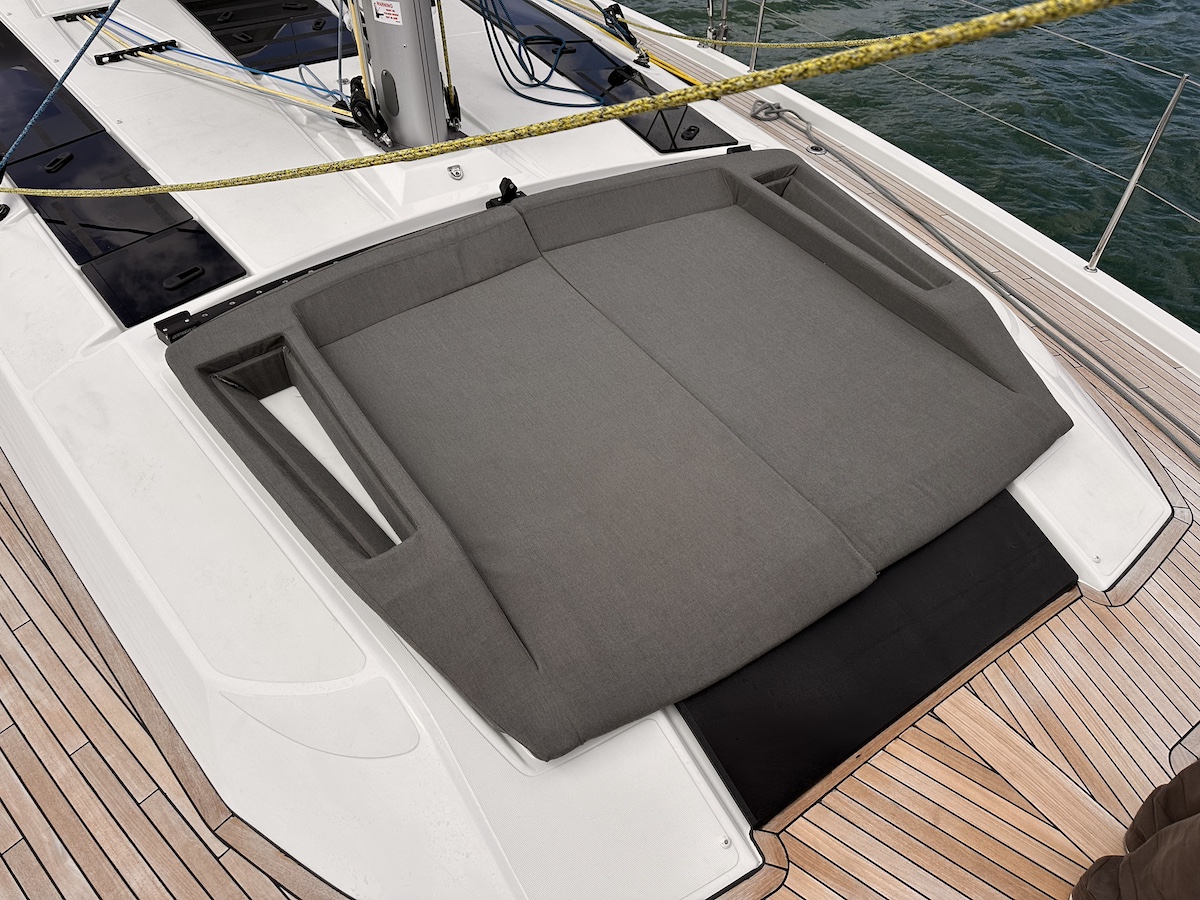 Además, en proa, el Dufour 48 incorpora un nuevo espacio sobre la pendiente frontal del tejadillo que ejerce de solárium o de zona para relajarse leyendo o conversando en el amarre lejos de las miradas de los paseantes, o simplemente para tumbarse en navegación con el horizonte como único límite de la mirada.