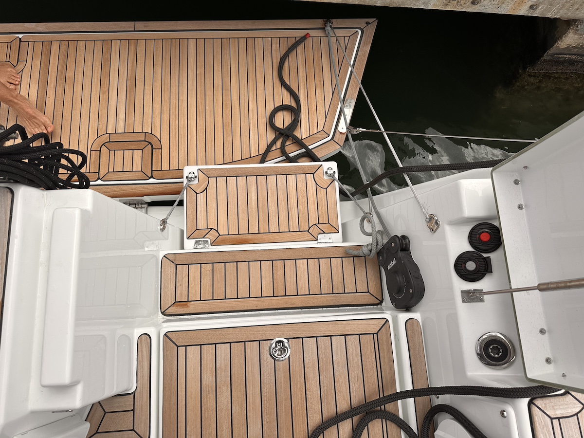 En navegación, esta distribución de los espacios de la bañera, a proa para el descanso y a popa para el gobierno y la maniobra, facilita moverse a bordo, ya que las dos mesas separadas dejan un amplio espacio central de paso hacia el tambucho al tiempo que ofrecen sujeción en los desplazamientos.