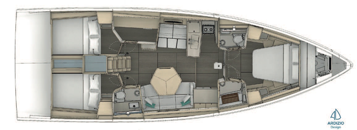 La mesa del salón central repite la hexagonal del Dufour 41 creada por el diseñador de interiores Ardizio Design y está optimizada para la versión de cocina longitudinal a babor.