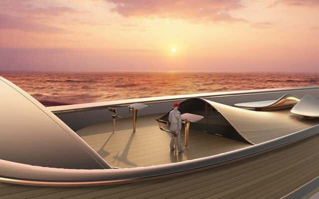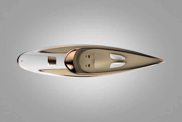 La cubierta del barco, que recuerda la forma de duna, se erige con formas esculpidas de la cubierta de teca que oculta los paneles de navegación y también revela el acceso a la cubierta inferior.
