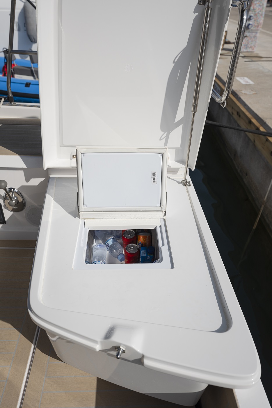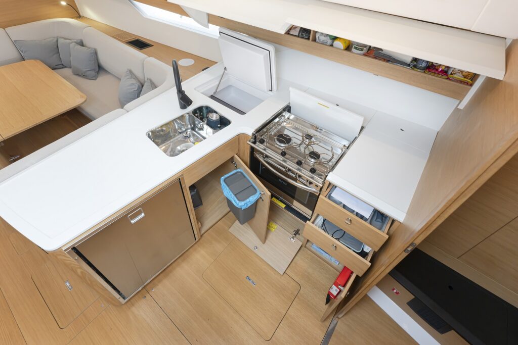 La cocina en L está situada en estribor apenas bajar la escalera. La superficie de encimera es suficiente para trabajar con comodidad. Es interesante la tapa que cubre los fogones ya que cuando está cerrada amplía la superficie de trabajo de la encimera. Considerando planes de navegación más largos, la importancia de poder mantener alimentos frescos es vital, por lo que el refrigerador de apertura frontal es de buen tamaño y también cuenta con una nevera vertical con puerta sobre la encimera. En general el espacio de estiba de alimentos es abundante lo cual se agradecerá en navegaciones más extensas con tripulación completa.