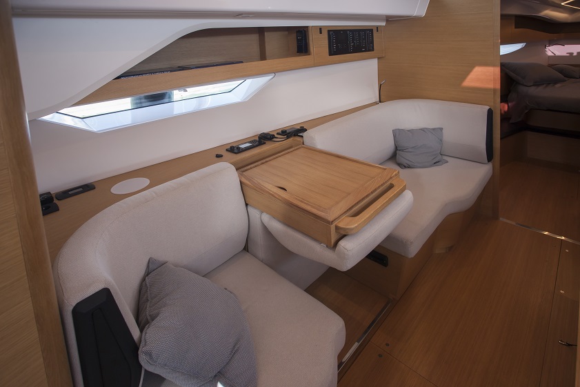 En la banda de babor, desde la pared del lavabo hasta el mamparo de la cabina de proa hay un banco longitudinal cuyo asiento central gira hacia crujía para desplegar la mesa de navegación. Una idea sin duda original, pero en ceñida amurados a babor, dudo que alguien pueda sentarse; por suerte ya no trabajamos con cartas de navegación de papel, pero bien puede ser utilizada como mesa supletoria.