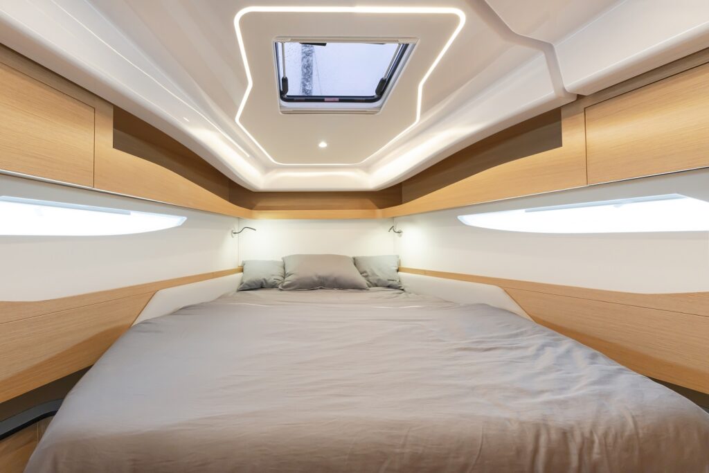 El astillero ofrece dos opciones de interior en la que solo cambia el cuarto de baño de la cabina de proa, situado a babor o a estribor. En la unidad que hemos tenido oportunidad de navegar estaba a estribor y con ducha compartimentada, en cambio en la otra opción no hay ducha, es más pequeño, pero se ofrece un asiento vestidor y un amplio armario. El astillero también ofrece dos opciones de maderas, roble natural con acabados de madera maciza o una opción más ligera en madera de ocumé para quienes no escatiman en ahorrar peso a la hora de ser más rápidos.