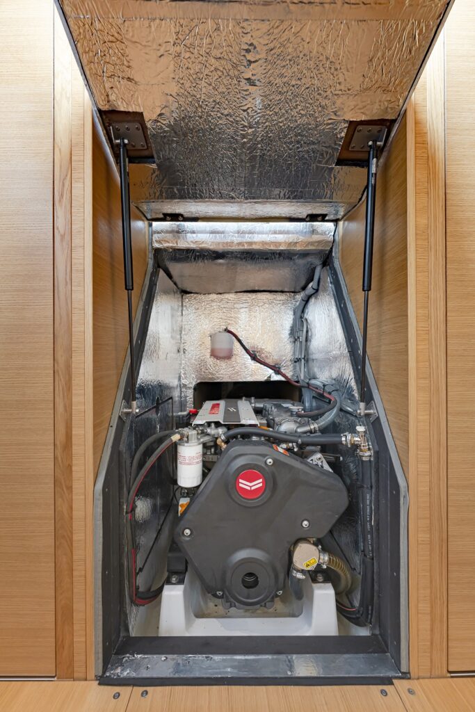 Esta unidad estaba equipada con un motor Yanmar de 80 hp, que es una de las opciones, no es necesaria tanta potencia, pero fue la opción escogida por la persona que adquirió esta unidad con la que logra una velocidad de crucero de 7,8 nudos a 2.200 rpm. Otra de las opciones que ofrece la E Line de Elan es una doble propulsión eléctrica de Oceanvolt con el modelo ServoProp de 15 kW cada uno y un pack de baterías de litio de 43,2 kW para la versión 100% eléctrica o 28,8 kW en la versión híbrida.