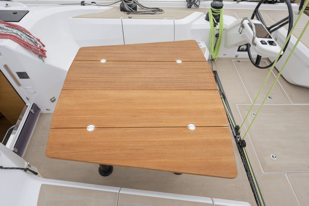 La bañera es amplia y cabe la posibilidad de instalar una doble mesa de alas abatibles. La zona de los timones queda protegida por un bimini y la posibilidad de unirla a la capota antirrociones que parte desde proa del piano de drizas.