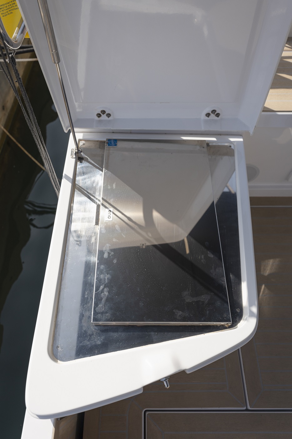 Antes de subir a bordo y con solo un vistazo, son evidentes algunos detalles que hace a la seguridad en navegación, como las regalas sólidas y amplias que forman parte del moldeado en fibra, la escotilla de acceso al interior elevada o la plataforma de baño que, plegada, actúa de espejo de popa evitando la salida directa a ras del plan de la bañera.