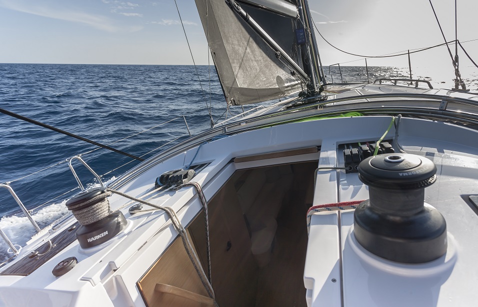 La vela mayor de 68,56 m², el foque de 53,71 m² y el gennaker de 201,7 m² es la configuración estándar y durante la prueba navegamos con foque y código 0. Había 8 personas a bordo, un viento real de entre 7 y 10 nudos y marejadilla. En estas condiciones navegamos cómodamente en ceñida llegando a un ángulo máximo de orzada de 33° con una velocidad de 7,2 nudos y un viento real de 9,3 nudos, mientras que navegando con Código 0 y la misma intensidad de viento, logramos 9,2 nudos con un ángulo de 90°. El comportamiento al timón es muy estable, navegando en ceñida se apoya en la arista y, con un buen equilibrio de trimado, mantiene perfectamente el rumbo. La escota de mayor tiene una configuración en T y llega al winche dedicado que está al alcance de quien lleve el timón. El inconveniente es que el winche no se puede utilizar para otra función, haría falta un stopper para bloquear la escota y liberarlo. El carro de escota enrasado en el plan de la bañera facilita el tránsito. Los tres pares de winches Harken son perfectos para la maniobra. Uno de ellos, el de drizas de babor, es eléctrico y es de agradecer que así sea.