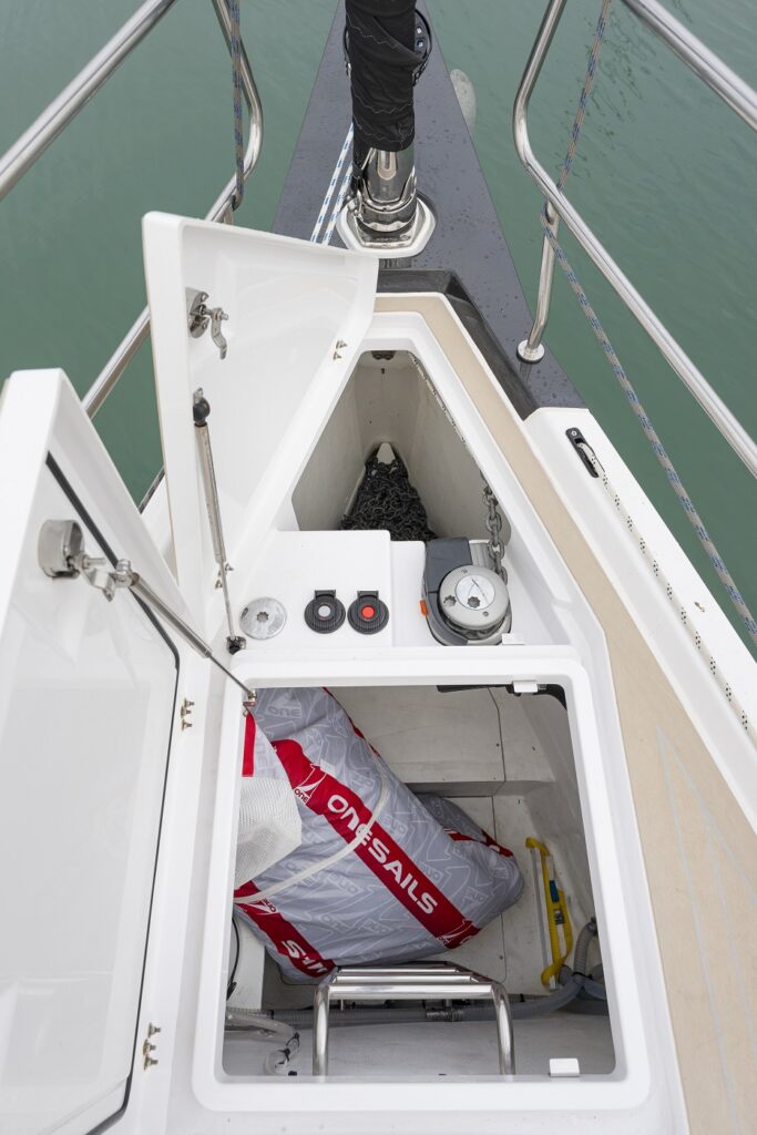 En proa, el enrollador eléctrico bajo cubierta permite que la base del foque baje casi a ras de cubierta. Más a proa se ha dispuesto el enrollador del código cero y en el extremo del botalón un anclaje para un spinnaker asimétrico.