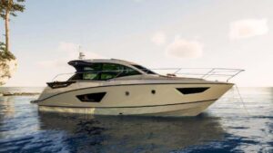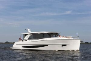 Jeanneau alcanza altos niveles de soluciones para la vida a bordo, como el solárium de popa que se desplaza, la puerta lateral, la convertibilidad de la dinete interior, entre otras. Se motoriza con dos Volvo Penta de 220 Hp y admite hasta 10 plazas en categoría C y 8 en B.