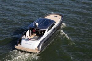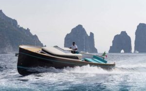 Apreamare se desmarca con este Gozzo de sus modelos clásicos. Una carena de semiplaneo, capaz de sobrepasar los 33 nudos, motorizada con dos detrofuerabordas de 200 Hp, y dotada de una cubierta de revolucionario diseño. Un modelo innovador con una estética atractiva.