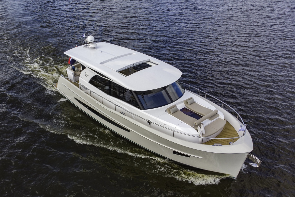 Astillero holandés que apuesta por este modelo de formas innovadoras, con una gran bañera abierta, dotada de enorme solárium a popa, y gran dinete central, y con un flybridge equipado con puesto de gobierno. Barco de programa familiar con la polivalencia de programa para la pesca y el crucero.