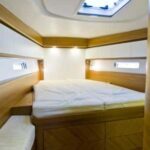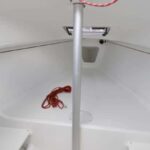 En la cabina que se esconde bajo la proa es posible pasar una noche. Tiene detalles como el enrollador enterrado, el bauprés telescópico y la barra de escota de mayor muy ancha que hablan de un barco bien pensado. Es austero, pero está bien hecho.