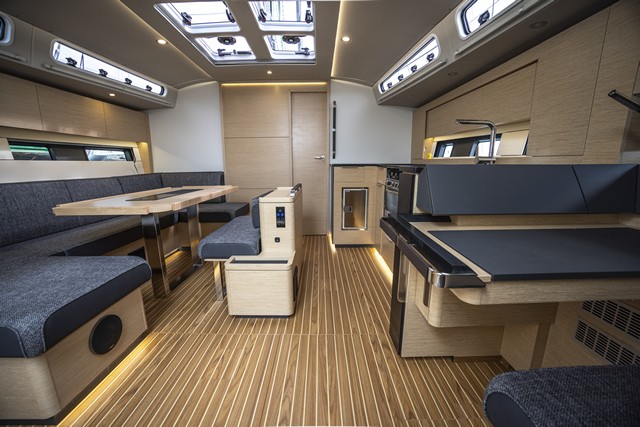 Mucho espacio en este casco diseñado por Germán Frers. Además, Magnus Rassy quería que los interiores estuvieran al mismo nivel desde la cabina de popa hasta la cabina de proa, para que ni siquiera tengas que preocuparte por ningún escalón cuando te muevas. En comparación con lo que se hizo en los modelos anteriores, el mástil se ha desplazado un poco hacia atrás, de modo que la cabina puede ser aún más grande. Por supuesto, nos gustó el bonito trabajo en madera en todas partes, pero también apreciamos la gran mesa de cartas. En cubierta, hay dos puestos de gobierno (como en el Hallberg-Rassy 57). Y el nuevo 50 no necesita mucho viento para alcanzar los 7 u 8 nudos.