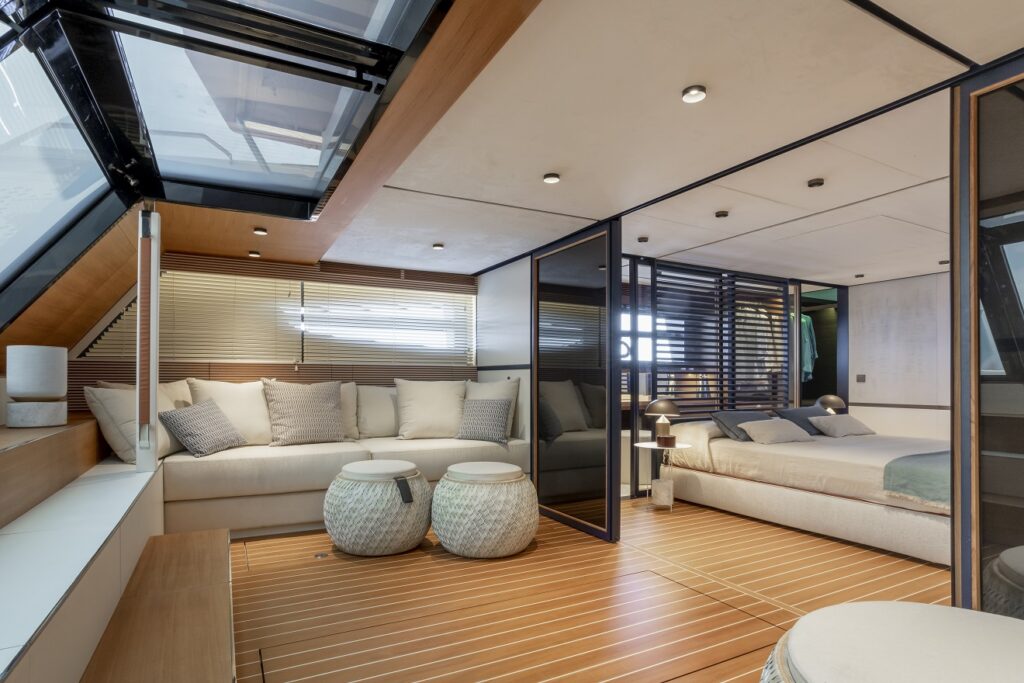 Tres escalones conectan con grandes puertas corredizas de vidrio el área de playa con un salón bajo que precede al camarote principal, lo que le permite realizar dos funciones: un patio al aire libre que ofrece protección contra el viento y el sol, y una sala de estar privada para el propietario. El propietario puede cerrar la puerta que conecta el salón y la cubierta exterior para crear una exclusiva suite de espacio abierto de 12 metros de largo que ofrece total privacidad tanto de día como de noche.