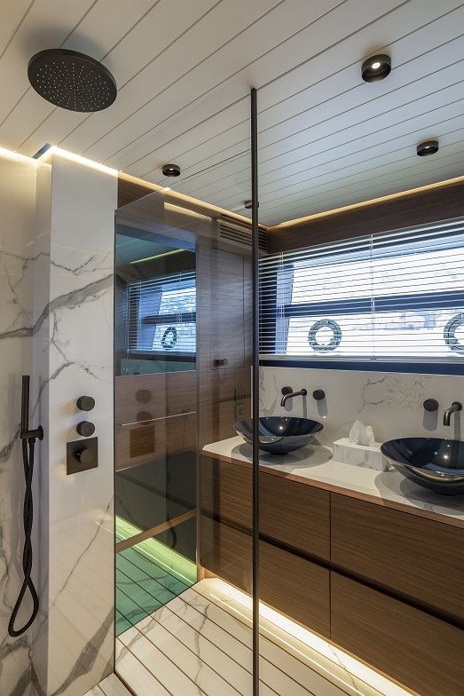 Como hemos dicho, la espaciosa suite del propietario en la proa, diseñada casi como un espacio separado, repite el patrón de la madera y las decoraciones en los exteriores, dando sensación de continuidad con el gran salón al aire libre.
