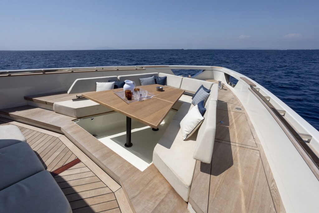 La zona de proa de la cubierta principal cuenta con un cómodo sofá en C, con una mesa central retráctil que se puede transformar en una tumbona a la sombra de un toldo triangular. Debajo de este sofá se esconde una piscina para refrescarse cuando uno no desea bajar al mar.