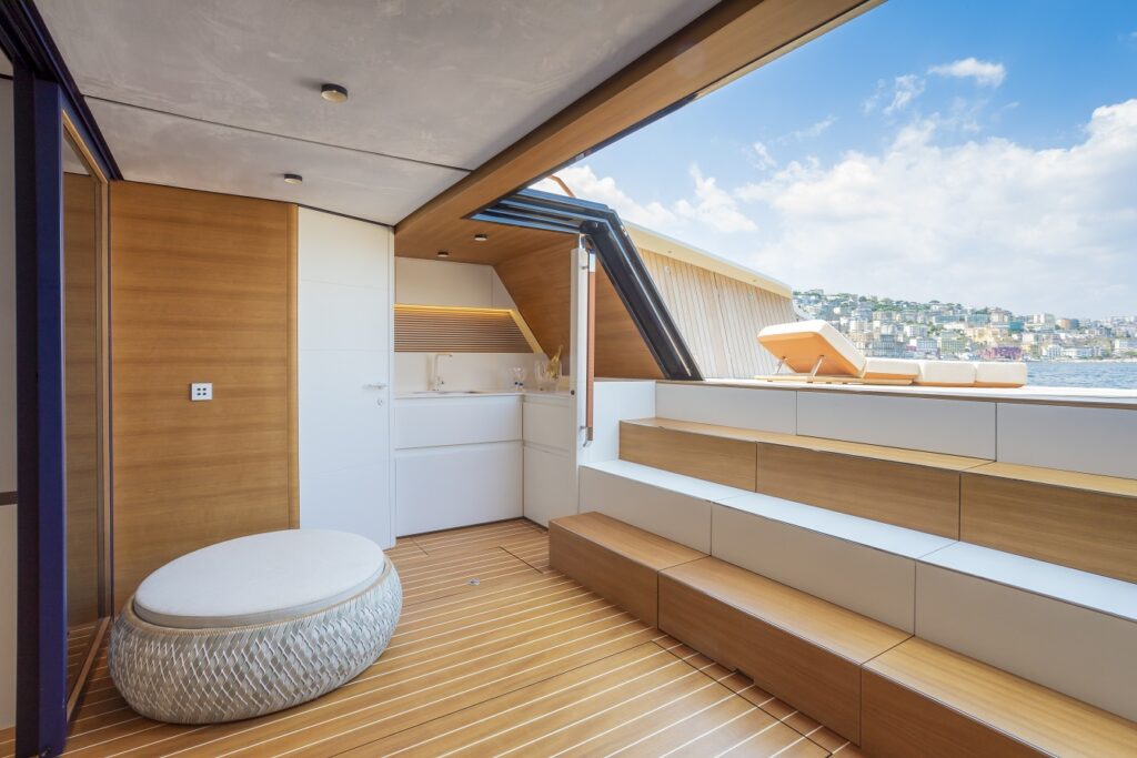 El Roof Top es una verdadera innovación en este segmento. El desafío para el diseñador fue darle un perfil plano para que no se pudiera ver de inmediato. Solo se accede por medio de una escalera hidráulica retráctil, con pasamanos telescópicos, y está equipado con una consola de timón retráctil que permite gobernar el barco sin tener que abandonar el Roof Top. Inspirado en las terrazas de los áticos modernos, cuenta con cuatro tumbonas, ducha y nevera