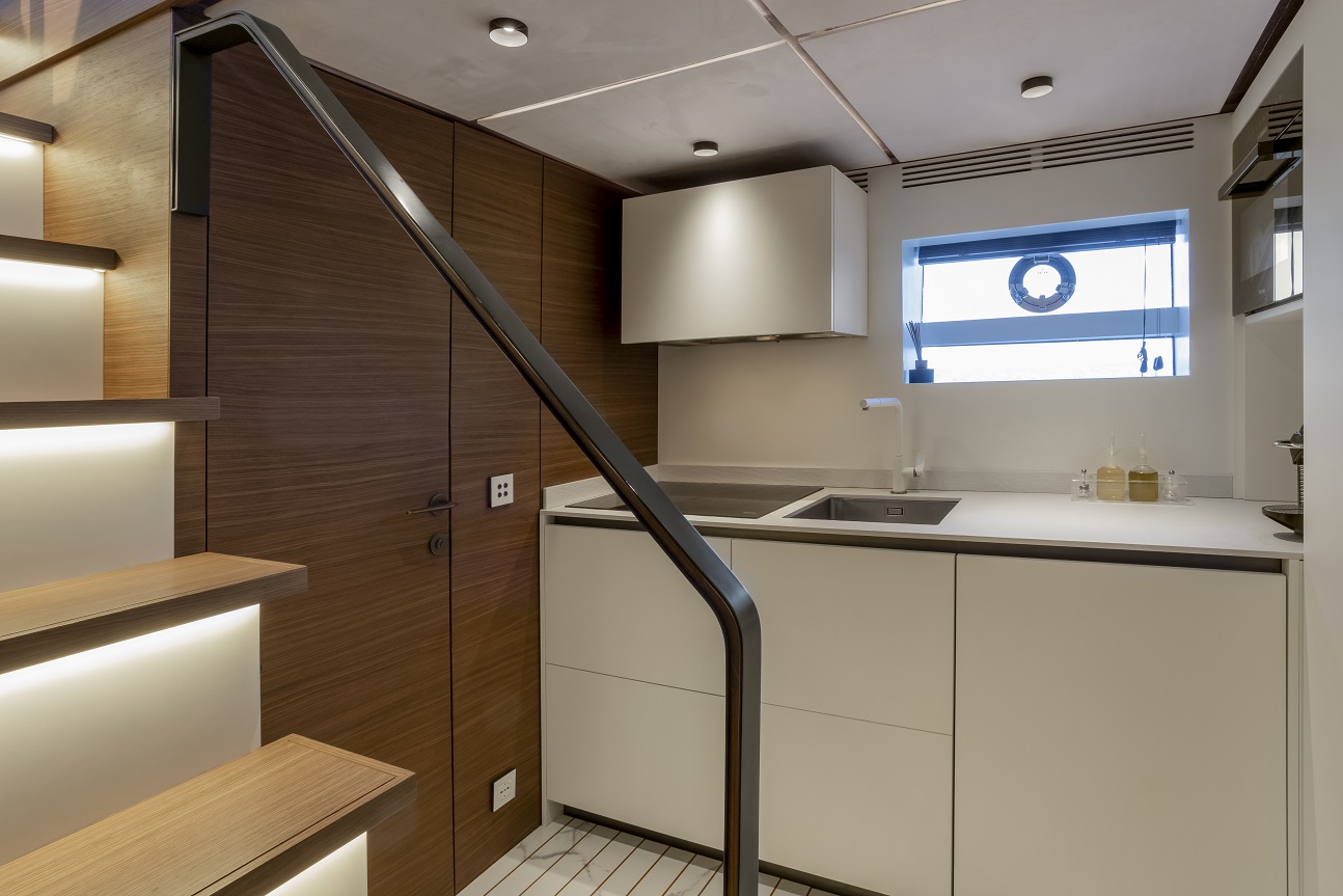 Por su parte, las zonas de almacenamiento, cuidadosamente ocultas, permiten estibar no solo una embarcación auxiliar con jet de 3,5 metros, sino también numerosos juguetes acuáticos, como una moto de agua, un sea bob y un scooter eléctrico.