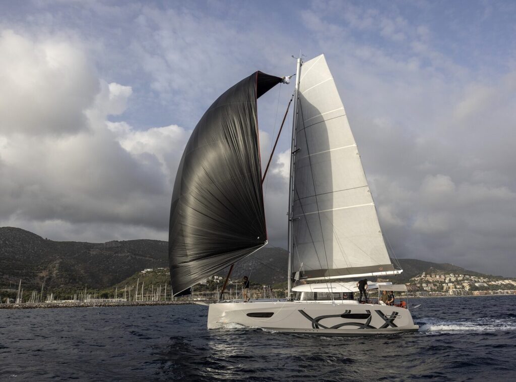 En este punto, vale la pena detenerse en algunos de los aspectos del diseño y la arquitectura naval, obra del gabinete VPLP, que acaban de definir el modelo y que, especialmente, determinan su comportamiento en el agua. Entre ellos, su aparejo adelantado, y la opción por la vela mayor trapezoidal y un génova de gran recubrimiento de serie para optimizar la relación entre la superficie vélica y el desplazamiento. Pero también un centro de gravedad bajo y el diseño asimétrico de la obra viva de los cascos —la experiencia del gabinete VPLP en multicascos de regata y crucero oceánicos es un grado—para reducir la resistencia hidrodinámica.