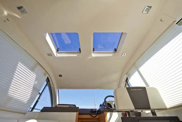 Sobrio, cómodo y con una consola bastante completa, presenta una distribución y colocación de determinados elementos que podrían mejorar la ergonomía del conjunto. El asiento, fijo y bastante alto, facilita la visibilidad y disfruta de un cómodo reposapiés. Las palancas de aceleración se han ubicado demasiado retrasadas, sobre un soporte añadido, de modo que si se colocaran sobre la consola a estribor resultaría mucho más fácil su control. También la posición horizontal sobre el panel de los indicadores de los dos Yamaha impedía su lectura debido al ángulo de la luz.