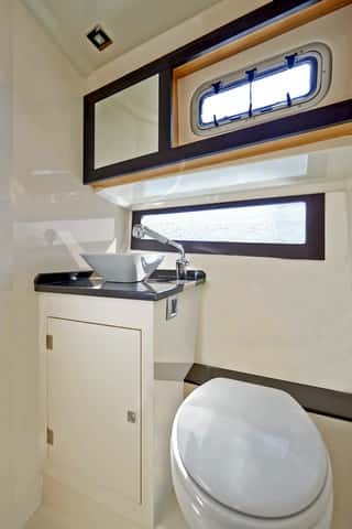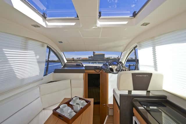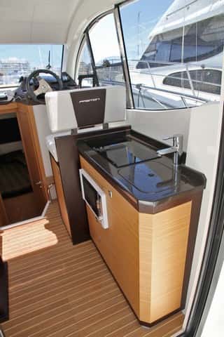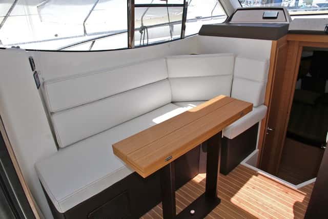 Arriba la dinete, con un sofá en forma de L dispone de una mesa alargada de alas plegables, que puede acomodar sin dificultades hasta cuatro o cinco personas. Delante el mueble de la cocina, junto a la entrada, dispone de dos fogones, fregadero, microondas y nevera, situada bajo el asiento del piloto. El espacio es luminoso y dispone de ventanas laterales y dos escotillas en el techo, que sustituiríamos por una grande, más práctica y eficaz para ventilar la cabina. La decoración se ha cuidado, con maderas y tapicerías de calidad, inspiradas en el estilo de Astondoa, en la que la elegancia y el buen gusto marcan un estilo muy personal.