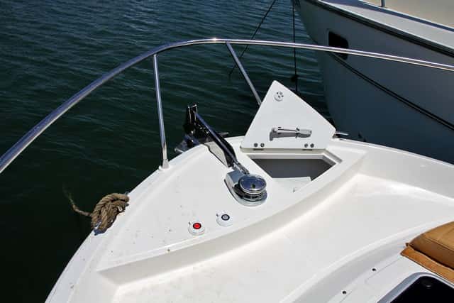 La zona delantera admite una colchoneta de solárium formidable –con pasamanos a los lados para mejorar la seguridad- que cubre todo el techo de proa y respeta la escotilla. Y en cuanto a la maniobra de fondeo, ésta es muy completa y adecuada, con un balcón de inox cerrado.
