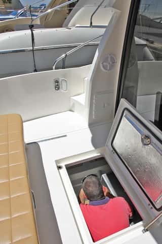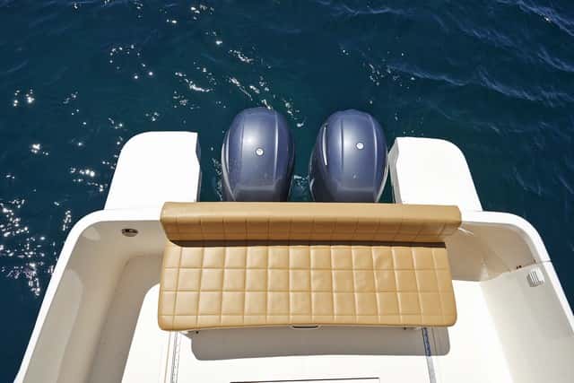 El banco de popa se desplaza sobre raíles para poder levantar la tapa que cubre los motores y poder elevarlos para sacar las hélices del agua. No obstante, la pieza que los cubre presenta por la popa un recorte de doble arco muy elemental en la fibra, no acorde con la calidad del barco. Además, esta gran carcasa motiva una reververberación del ruido de los motores que poco contribuye al confort en la navegación.