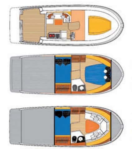 Las versiones varían únicamente por la cabina de proa, que puede estar ocupada por una cama de matrimonio o por una dinete convertible. Por lo demás, el resto del barco es idéntico en cuando a su distribución. En la zona privada una litera a media eslora, abarcando toda la manga, se complementa con el gabinete de aseo independiente.