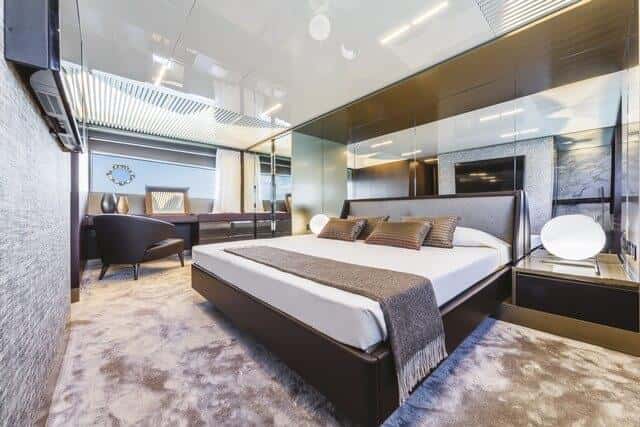 La cabina del propietario ocupa toda la manga y se abre al mar a través de enormes cristaleras a toda la altura.