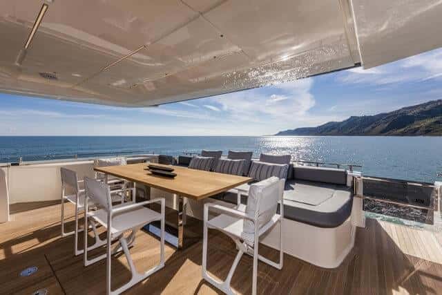 La cubierta de popa es accesible desde ambas bandas y está amueblada con un llamativo sofá que admite diferentes usos gracias a su respaldo plegable, ya sea como tumbona o como confortable asiento para comer alrededor de una gran mesa exterior.