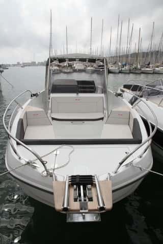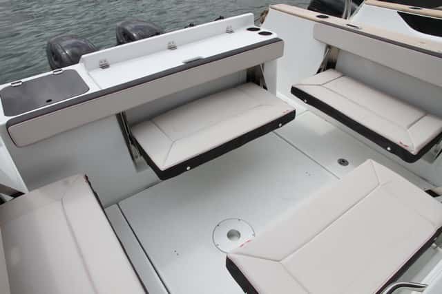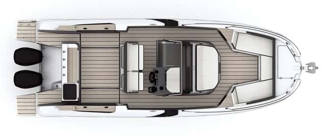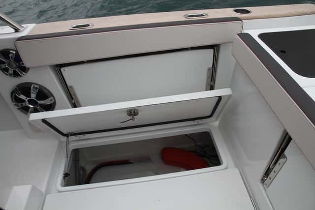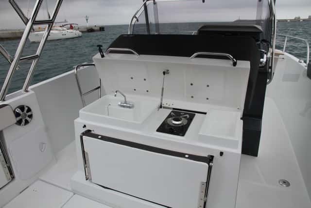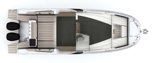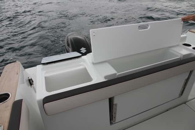 En general en la SpaceDeck la bañera se inclina más por un diseño polivalente para la pesca, con la zona de popa adaptada con un módulo para vivero y de trabajo, aunque respeta el paso directo a la plataforma de baño como en la SunDeck. En la SpaceDeck la pieza T-Top, es un opcional importante, pero los detalles de los portavasos, pasamanos de inoxidable, la maniobra de fondeo y el balcón semiabierto para facilitar el paso al pantalán, son elementos comunes en ambos modelos.
